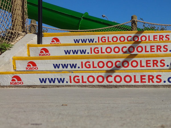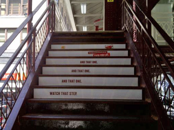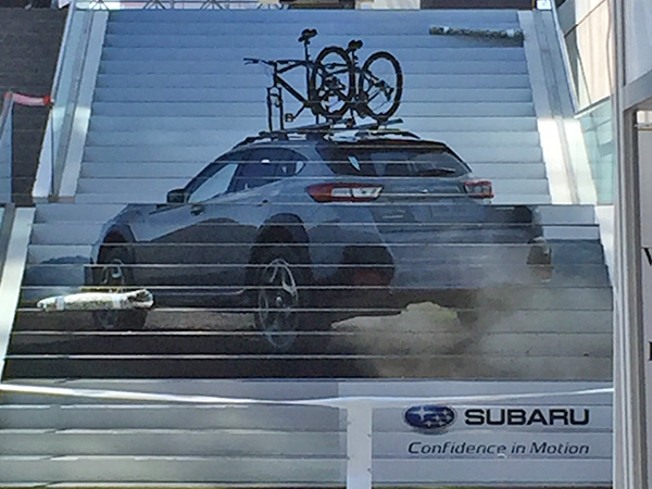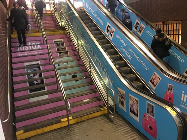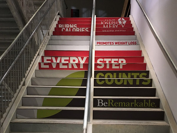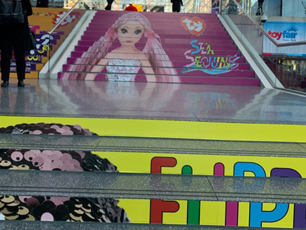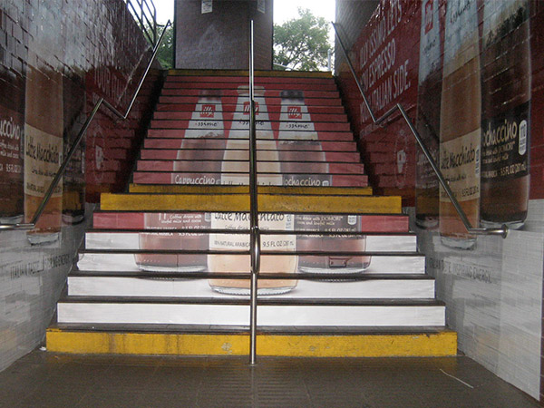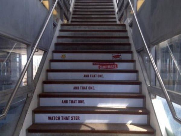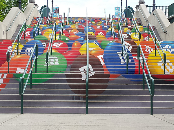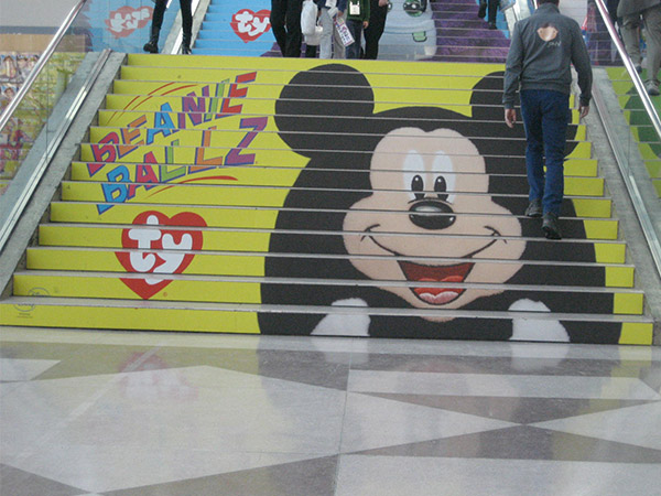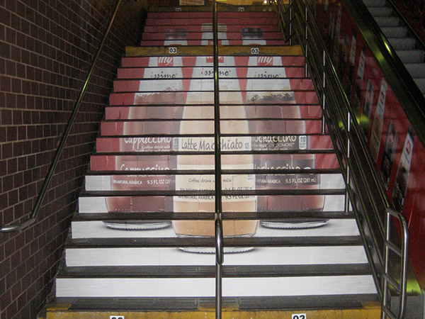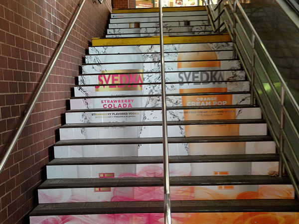 EXCLUSIVE RIGHTS TO STAIR GRAPHICS SINCE 1998, WE HAVE A PROPRIETARY MATERIAL SPECIFICALLY MADE FOR STAIR GRAPHIC ADVERTISING.